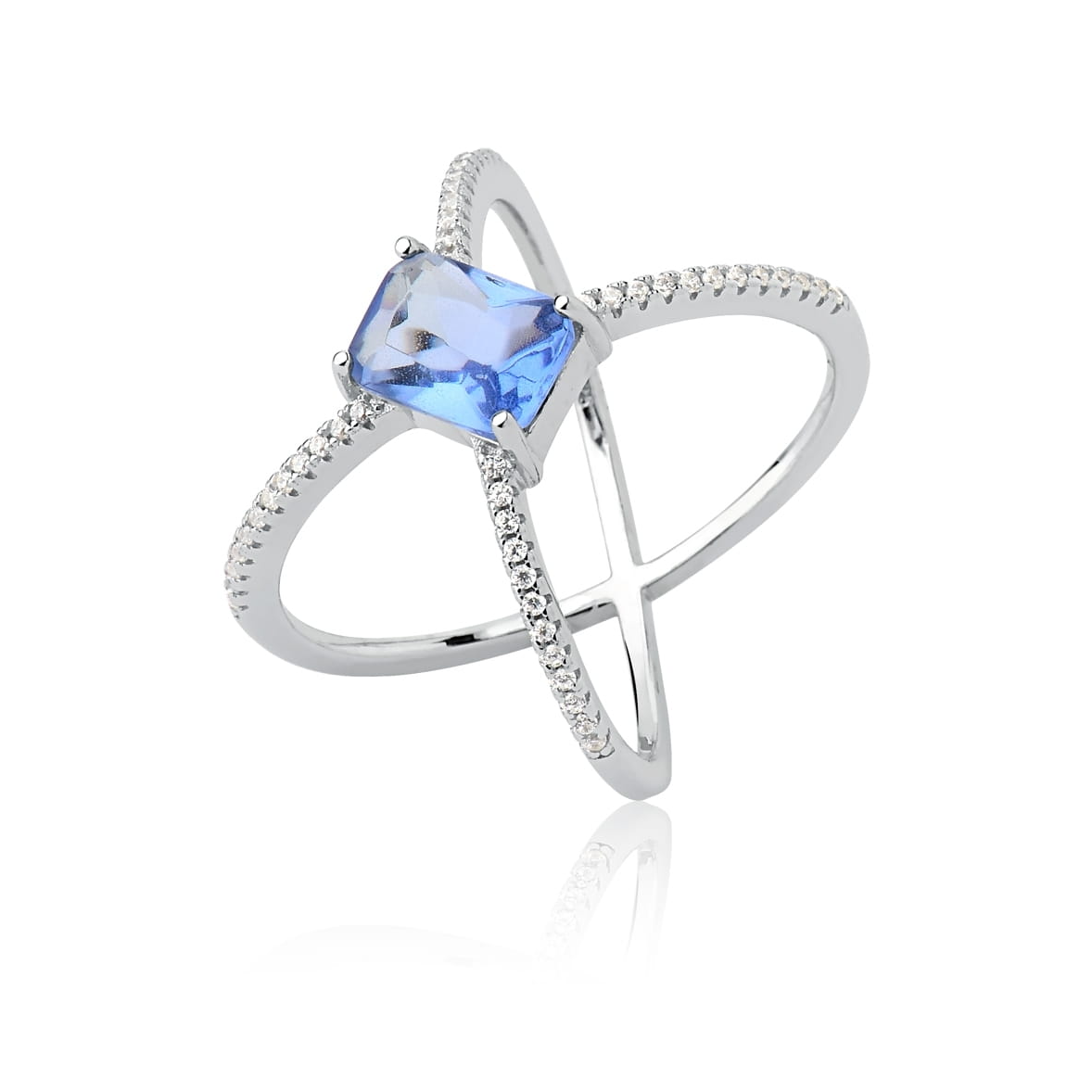 Compre agora e destaque-se com a beleza e a elegância do Anel X em Prata com Pedra Retangular de Tanzanita e Cravação de Microzircônias!