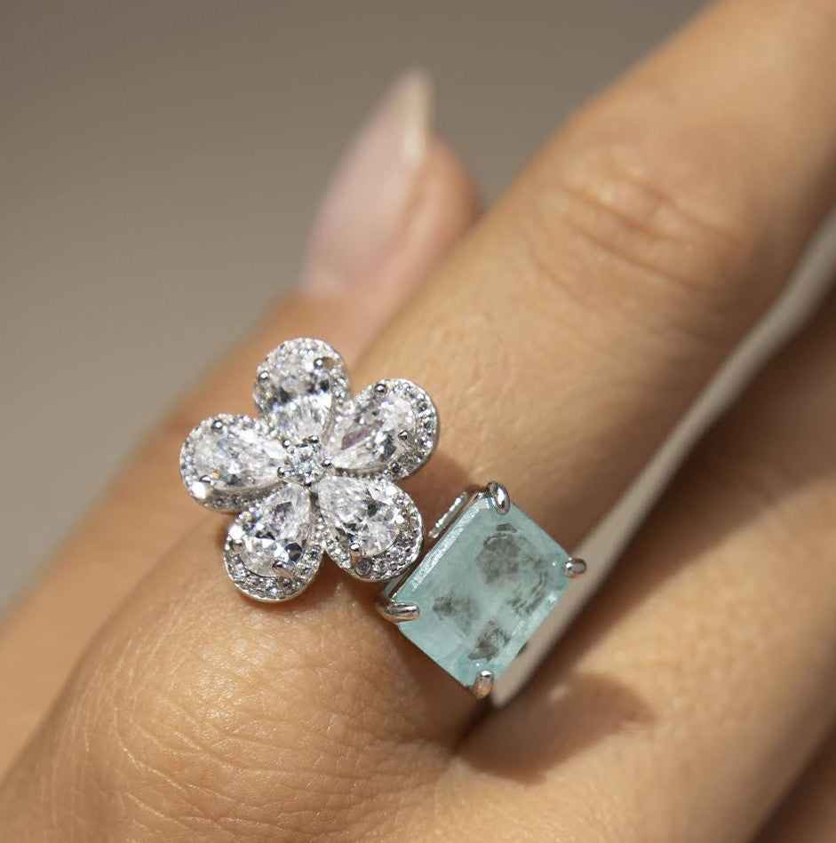 Anel com turmalina fusion retangular e flor cravejada de zirconias.