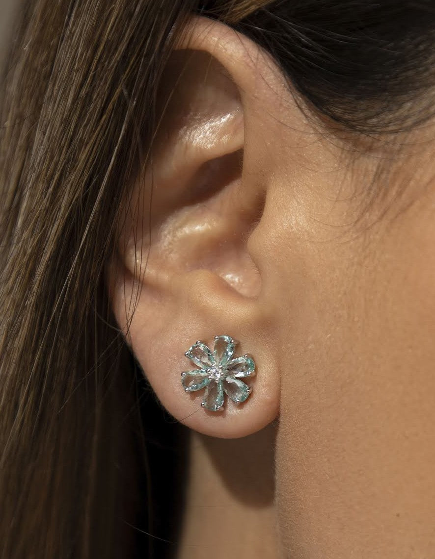 Brinco formato flor de gotas de cristal Paraíba e zirconia.