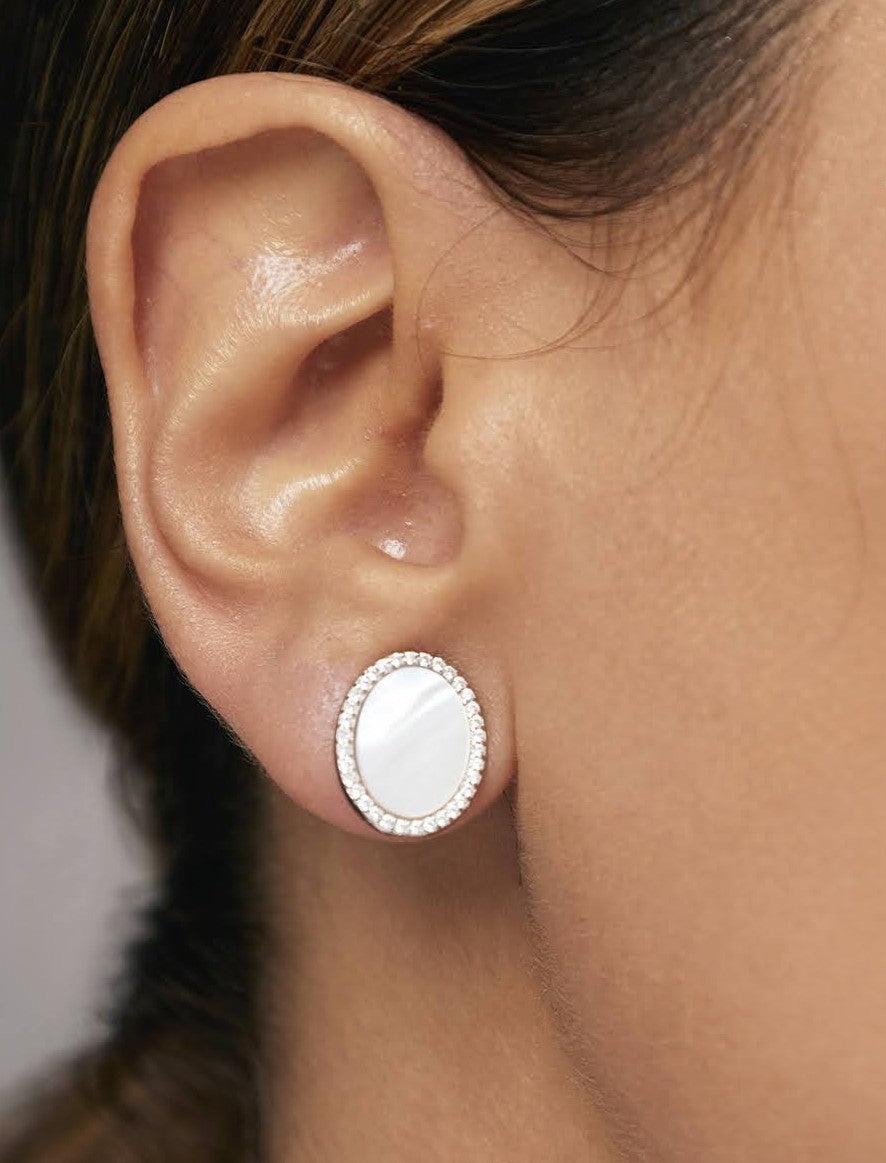 Brinco formato oval de madrepérola com zirconias.