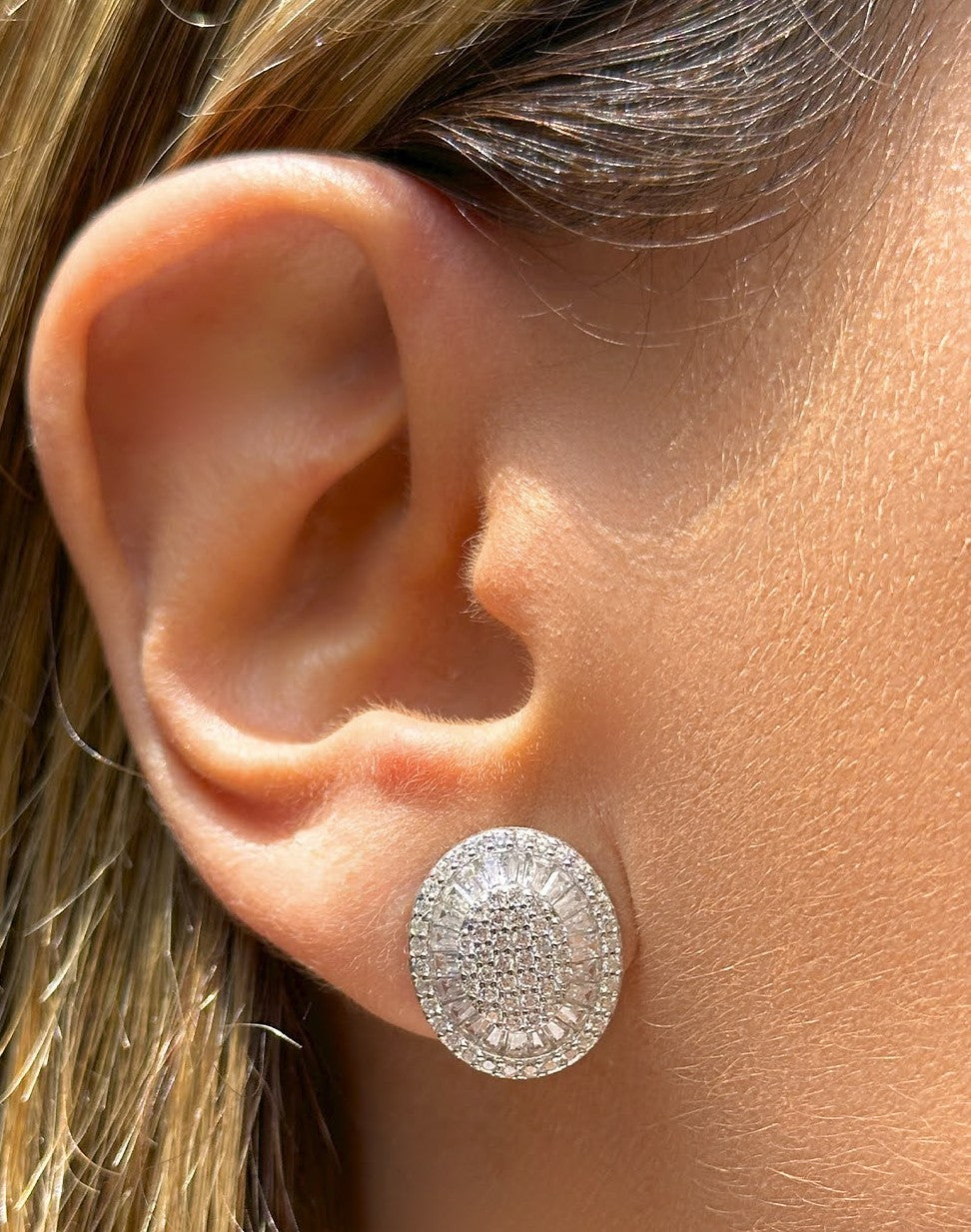 Brinco formato oval com zirconia baguete.