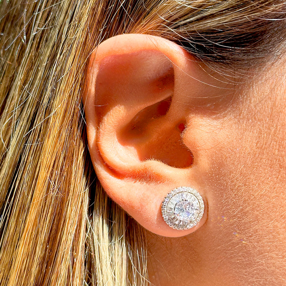 Brinco Redondo formato Pizza Prata 925 com Zircônia Cravejada.
