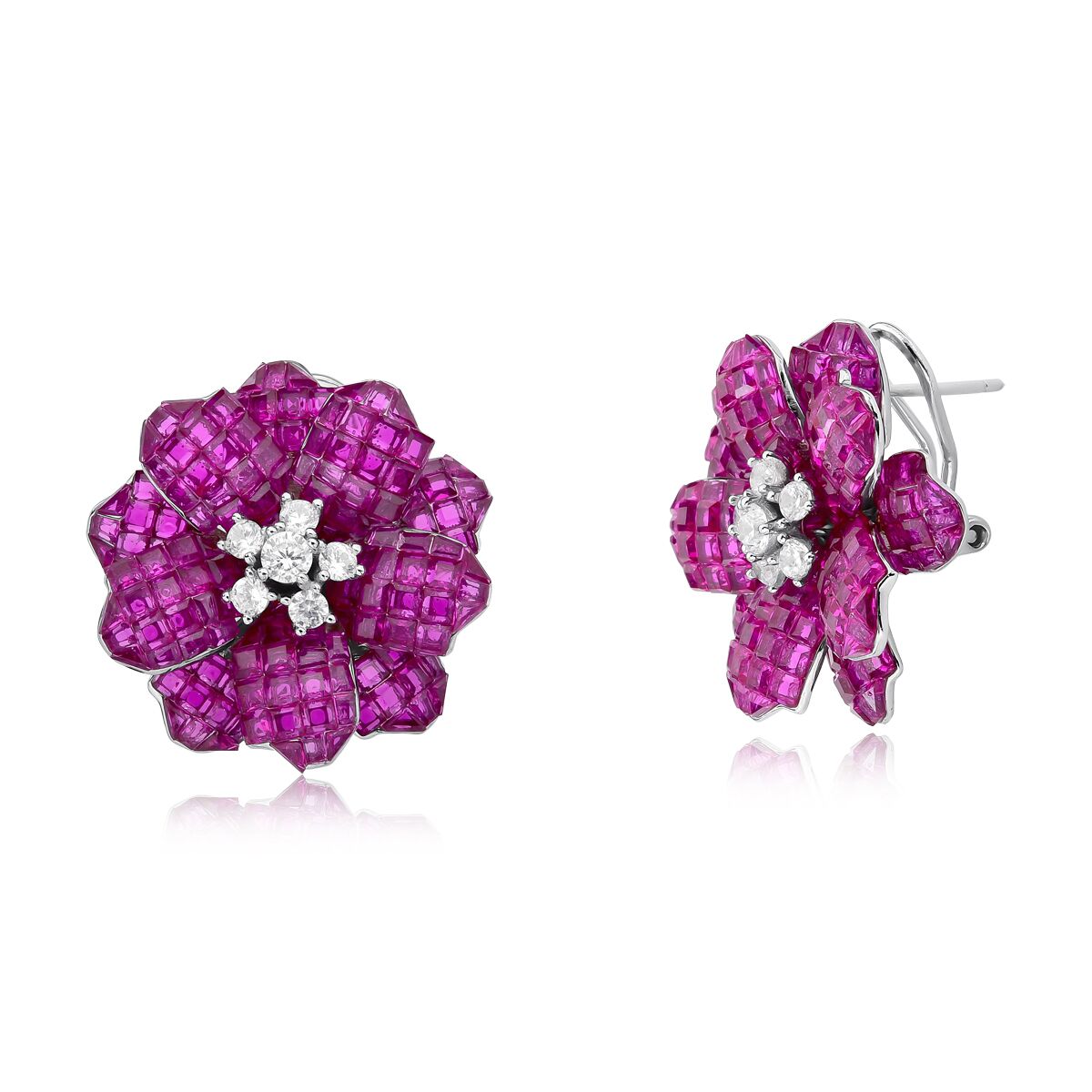 Aproveite para adicionar este brinco deslumbrante ao seu acervo de joias e ilumine seu visual com a sofisticação e o brilho do Brinco Prata 925 Flor Rubi Invisível Grande com Flor no Meio em Zircônia Cristal!