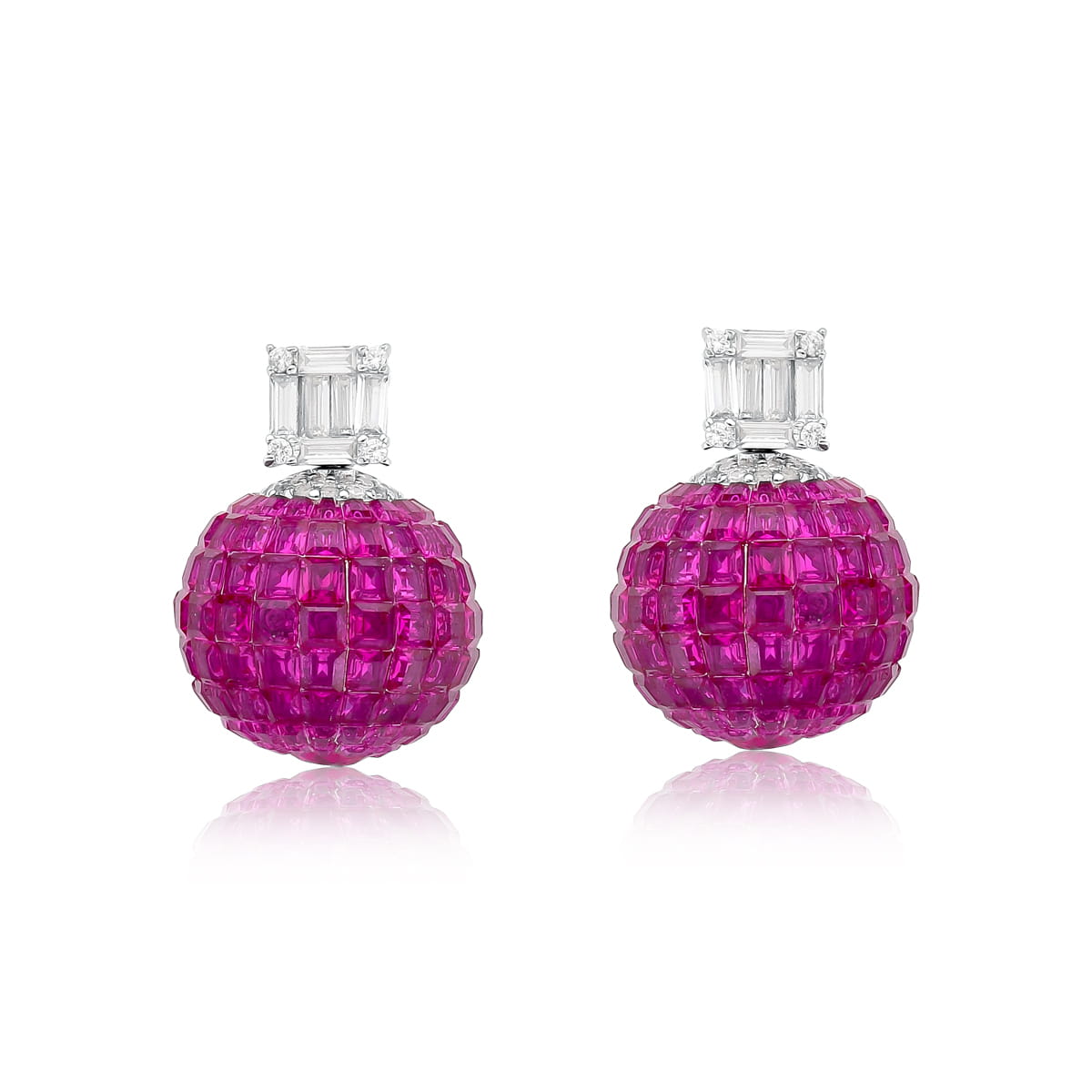 Compre agora e destaque-se com a beleza e a elegância do Brinco Prata 925 Quadrado de Baguetes com Bola Invisível de Rubi Pendurada!
