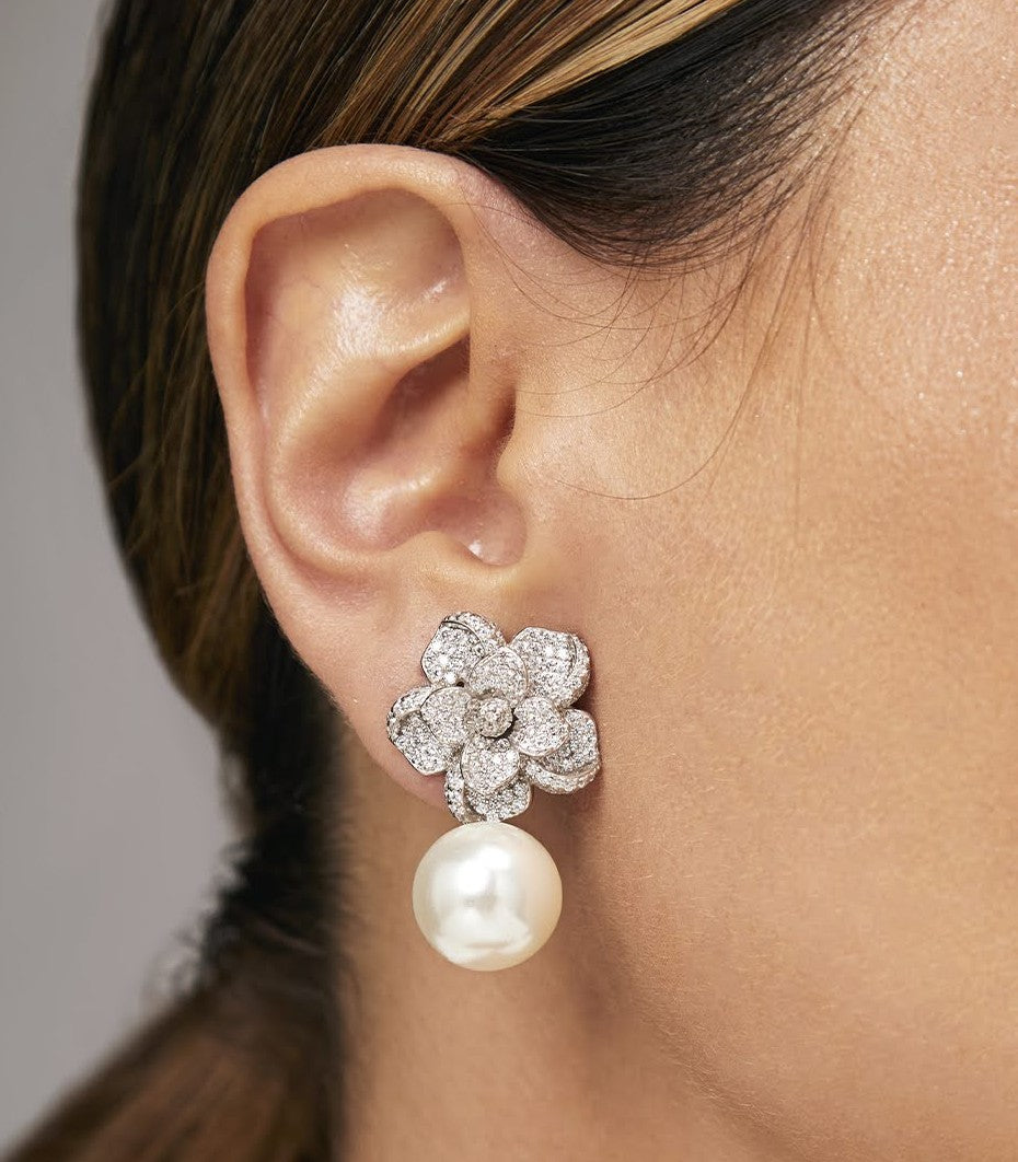 Brinco formato flor cravejada com zirconias e pérola shell.