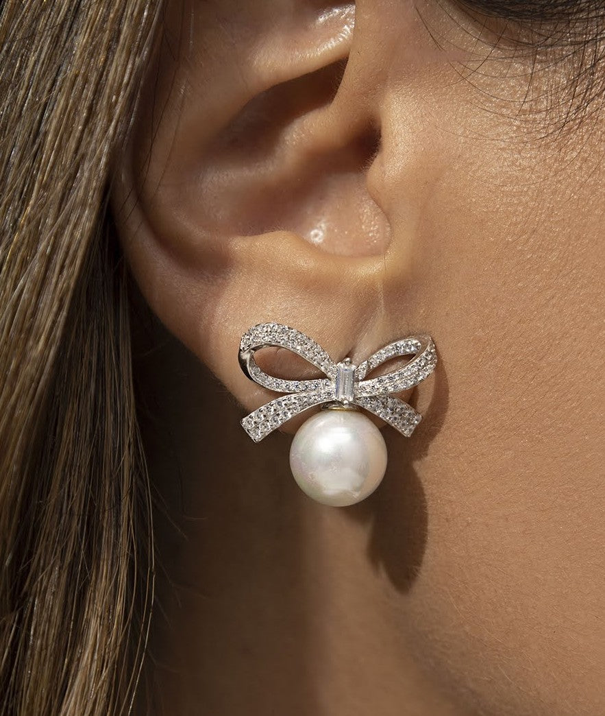 Brinco formato laço em prata com zirconias cravejadas e pérola.
