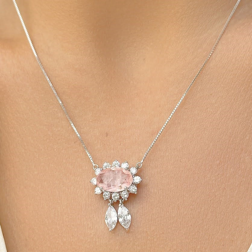 Este elegante colar apresenta um design sofisticado com uma pedra morganita oval central, rodeada por zirconias brancas no formato navete. O contraste entre a morganita rosa suave e as zirconias brancas brilhantes cria uma peça deslumbrante, ideal para ocasiões especiais.