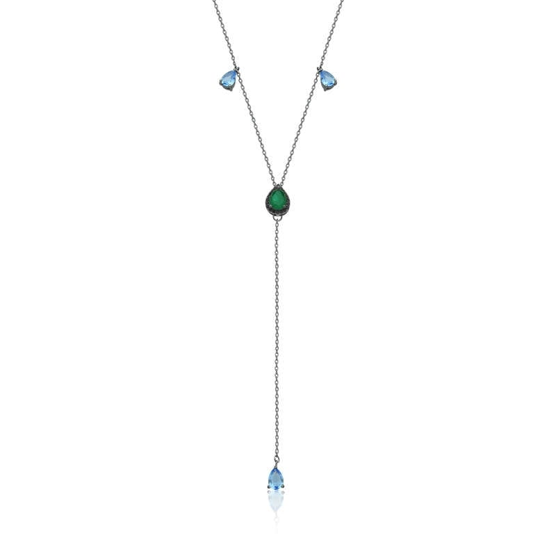 Colar em formato gravata com gotinhas de fusion penduradas.