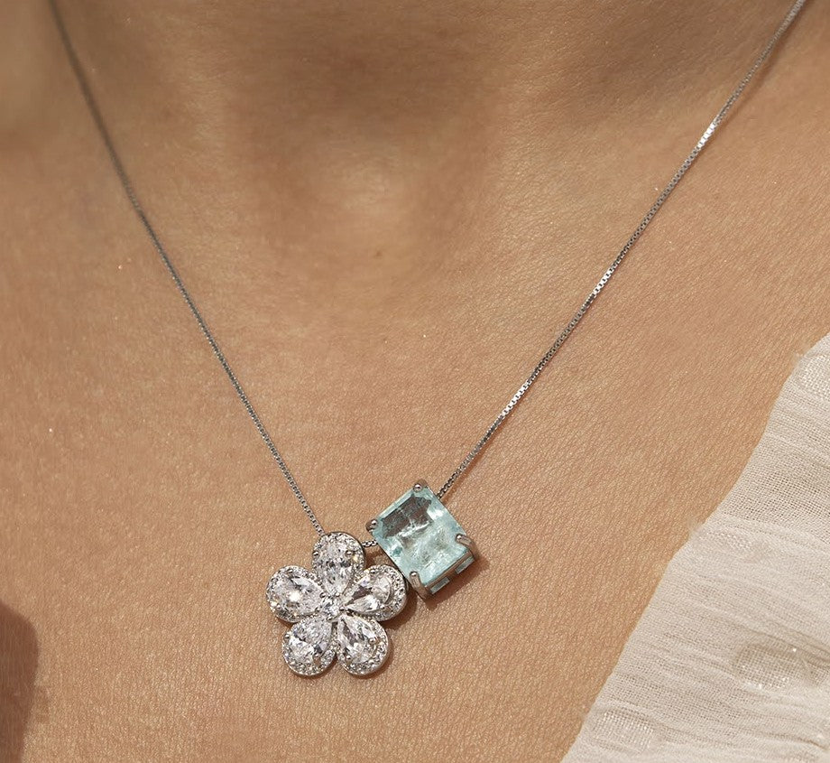 Colar em prata com pingente de turmalina fusion retangular e flor cravejada de zirconias.