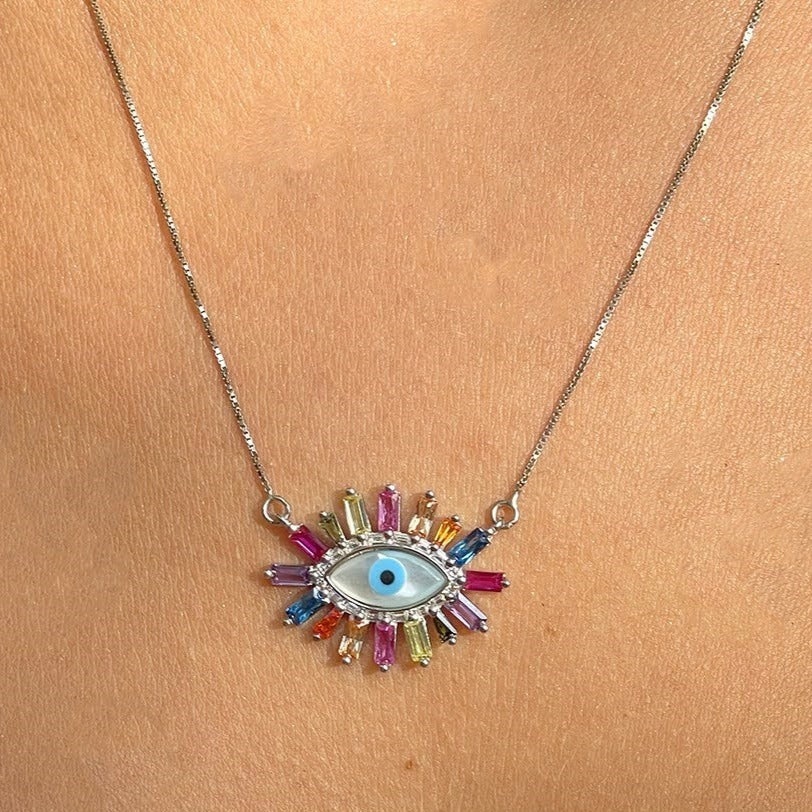 Este colar apresenta um charmosa peça com o tradicional símbolo do Olho Grego, adornado com pedras coloridas que adicionam um toque de brilho e cor ao design. O Olho Grego é conhecido por sua capacidade de proteger e afastar energias negativas, tornando este colar não apenas um acessório elegante, mas também um amuleto de proteção.