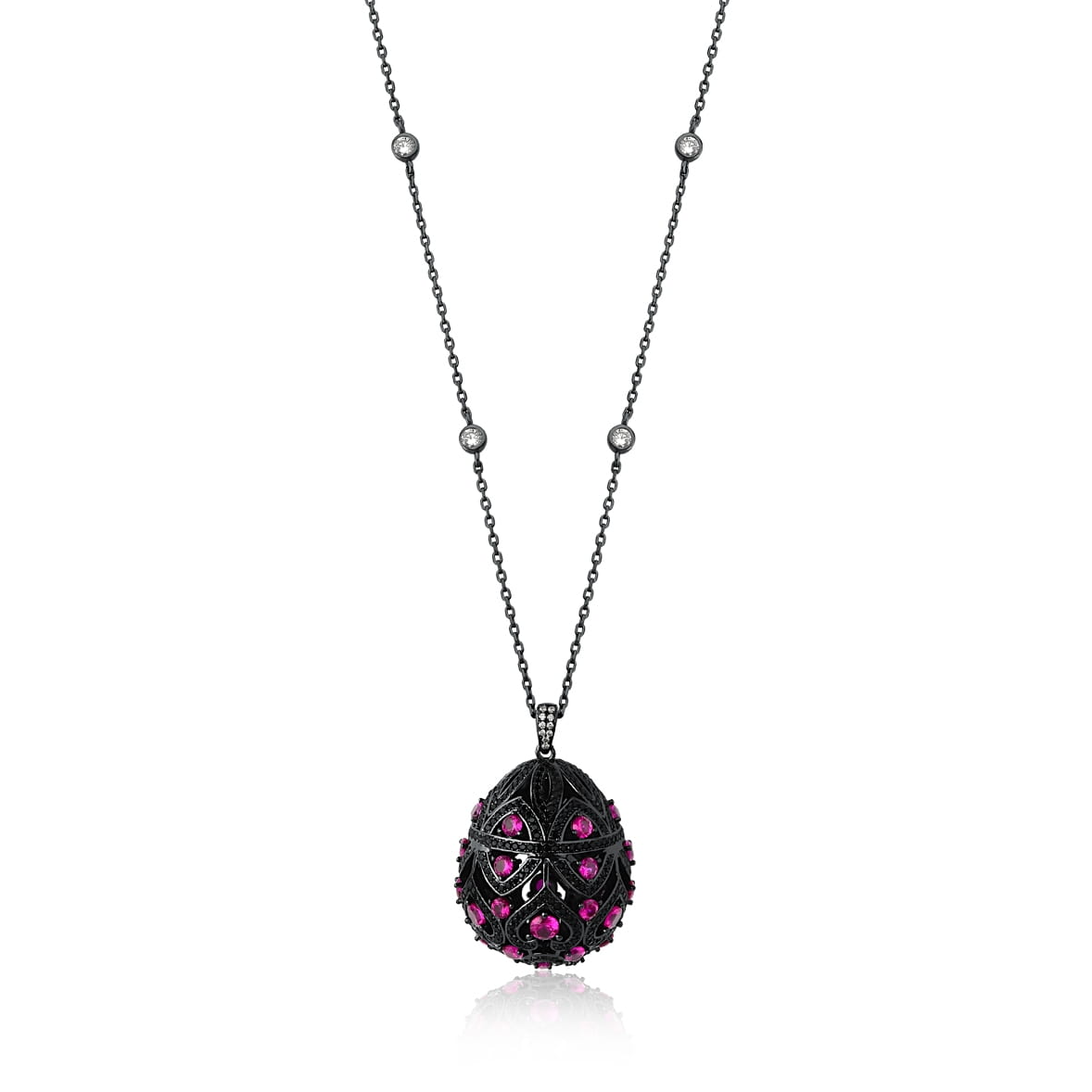 - Pingente: Ovo vazado cravejado com zirconias pretas e uma pedra rubi fusion