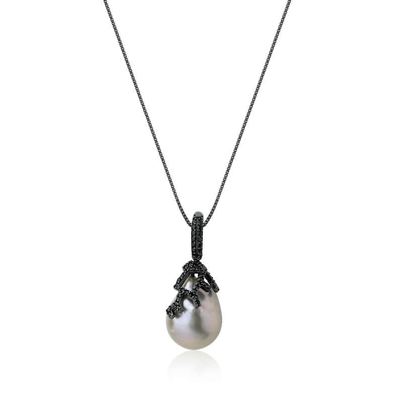 Este sofisticado colar de prata com banho de ródio negro apresenta um pingente trabalhado adornado com microzirconias pretas e uma pérola barroca pendurada. A peça combina a elegância clássica da pérola com o brilho moderno das zirconias, criando um visual requintado e contemporâneo.