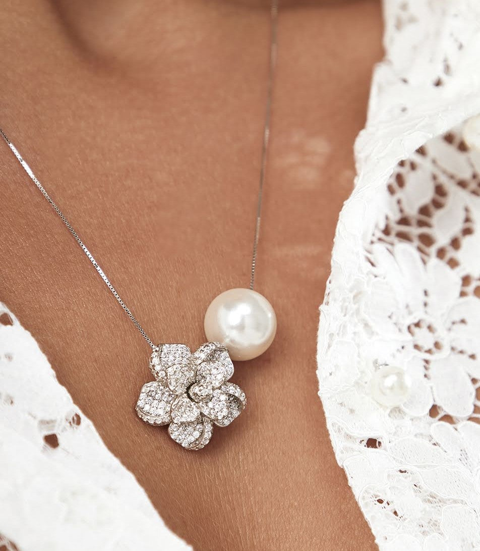 Colar em prata com pingentes formato flor cravejada de zirconias e pérola shell.