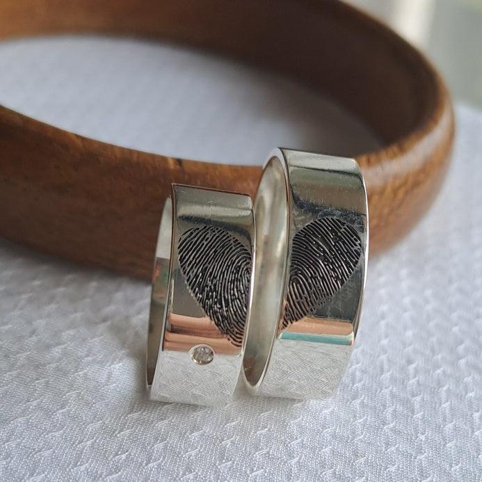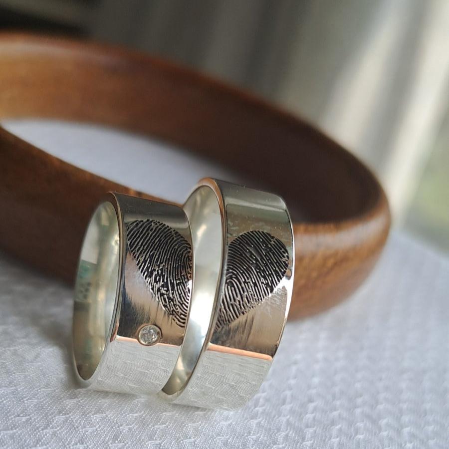 Descrições técnica: Par de aliança em prata com digitação gravada, 7 mm de largura.