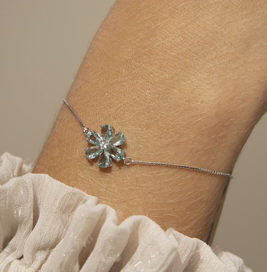 Pulseira em prata com pingente flor gotas cristal Paraíba e zircônia.