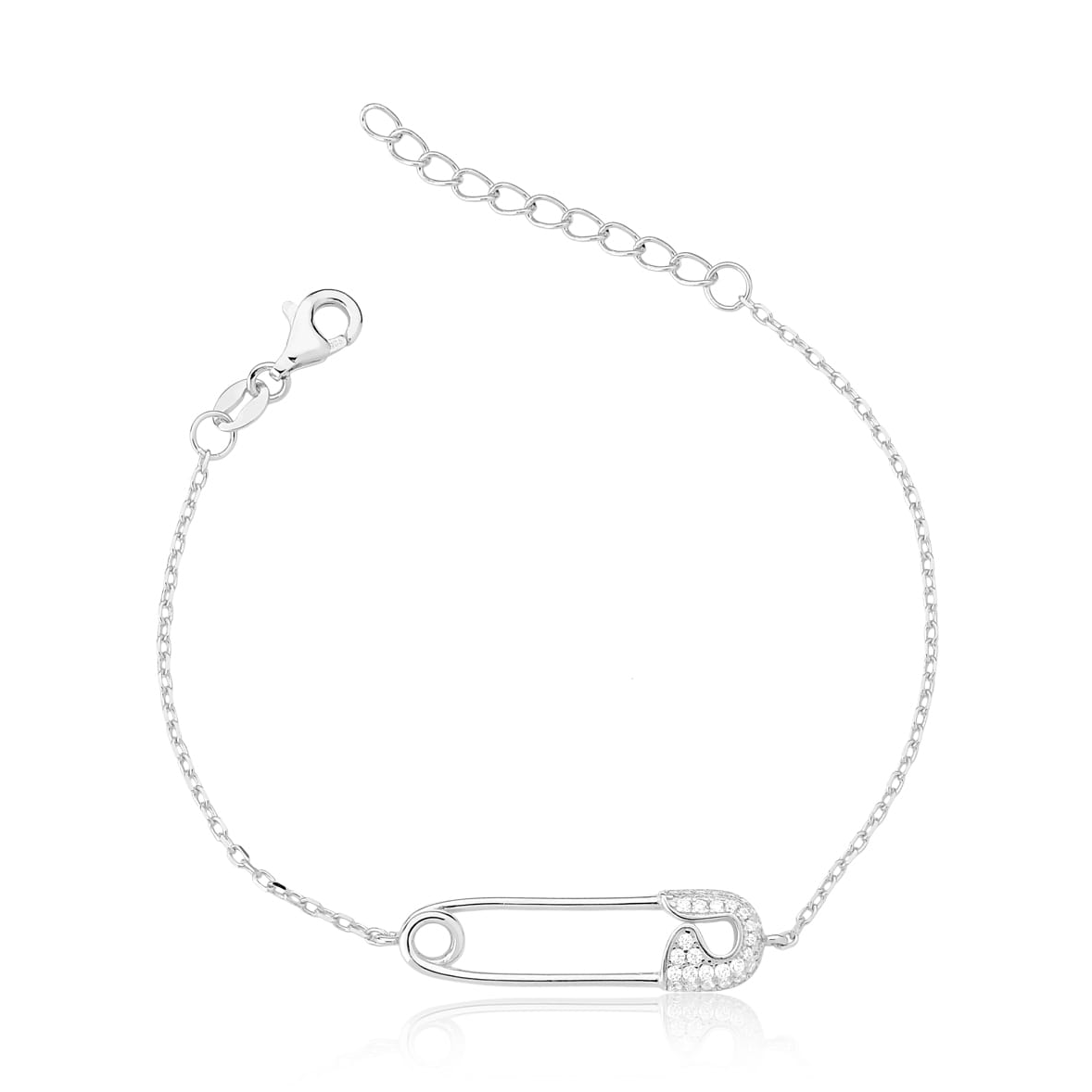 A pulseira Prata 925 apresenta um design sofisticado com inspiração em alfinetes, enriquecida com zirconias cravejadas. Esta peça combina elegância e modernidade, oferecendo um toque de glamour ao seu visual.