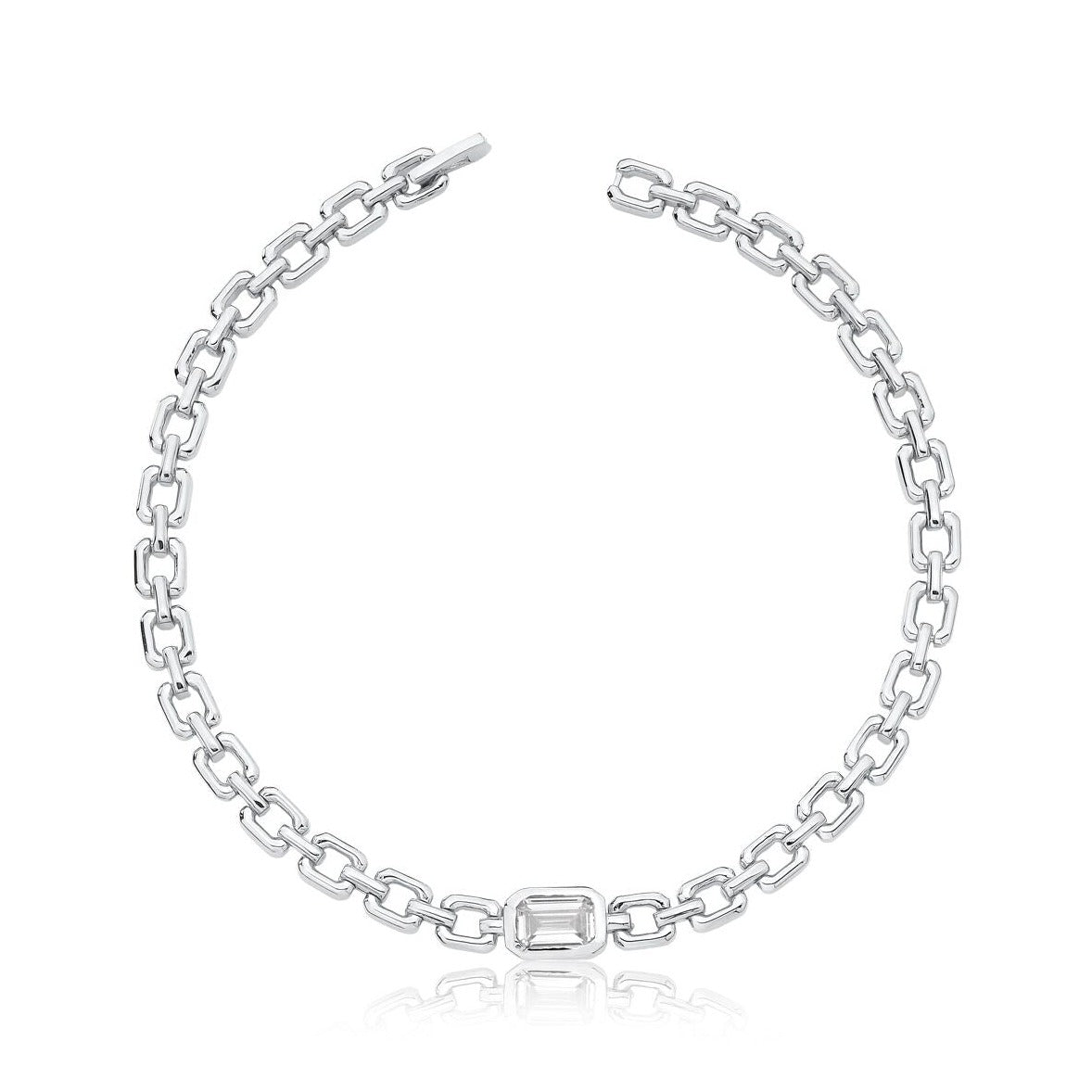 A pulseira em prata 925 banhada é uma peça elegante e moderna, destacando-se pelo design sofisticado com elos quadrados e um retângulo central cravejado com zircônia cristal. É perfeita para adicionar um toque de glamour ao seu visual.