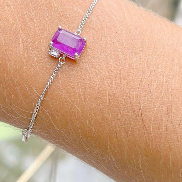 Esta pulseira em prata é uma peça sofisticada e encantadora, destacada por sua pedra roxa deslumbrante. Perfeita para adicionar um toque de cor e elegância ao seu visual, é ideal para ocasiões especiais ou para complementar seu estilo diário.